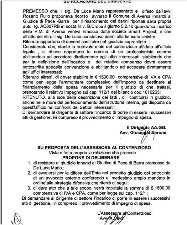 Quindi appare molto poco chiara la delibera di giunta municipale n° 229 del 26/04/2012, infatti nella stessa si legge che su proposta dell’assessore al contenzioso avv.to Alfonso Oliva, ed in riferimento alla richiesta di risarcimento danni dall’avv.to Rosario Rullo che in difesa del sig. De Luca Mario, cita in giudizio il Comune di Aversa per un presunto danno provocato dalla SMART PROJECT alla vettura del suo assistito durante una rimozione, per questo il Comune decide di avvalersi della consulenza di un avv.to esterno andando a spendere € 1.500,00.