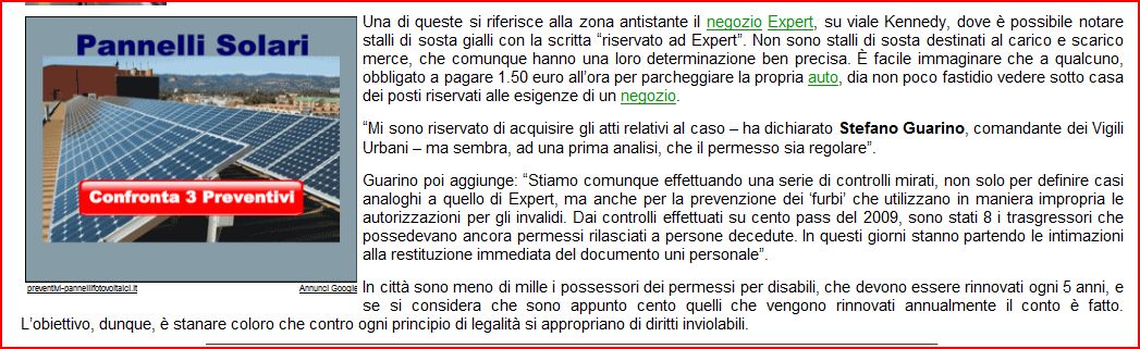 Guarino poi aggiunge: “Stiamo comunque effettuando una serie di controlli mirati, non solo per definire casi analoghi a quello di Expert, ma anche per la prevenzione dei ‘furbi’ che utilizzano in maniera impropria le autorizzazioni per gli invalidi. Dai controlli effettuati su cento pass del 2009, sono stati 8 i trasgressori che possedevano ancora permessi rilasciati a persone decedute. In questi giorni stanno partendo le intimazioni alla restituzione immediata del documento uni personale”.