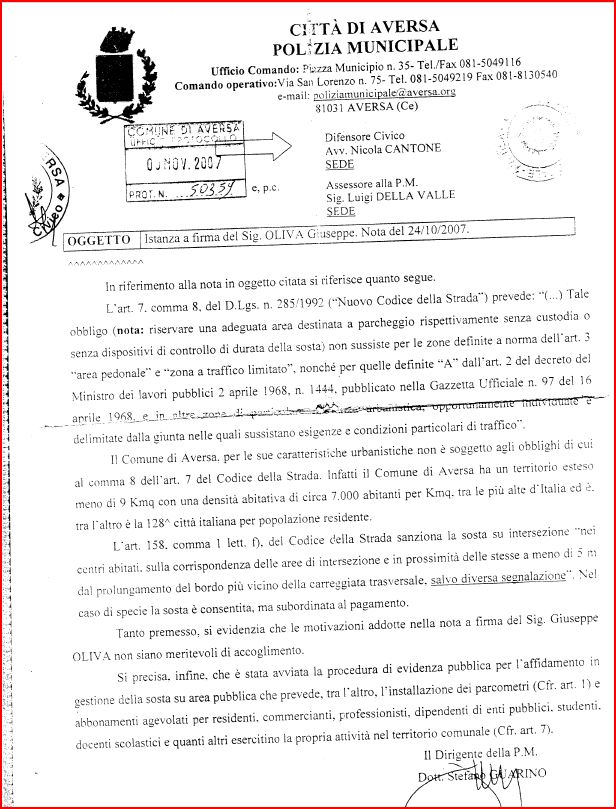Feci una regolare richiesta per ottenere quanto mi spettava di diritto, ricevendo risposta nel novembre 2007, la risposta recava la firma del comandante Guarino, lui stesso mi confermava il mio diritto, ma spegneva ogni mia speranza poichè mi comunicava che la città di Aversa era una zona di rilevanza urbanistica, quindi non soggetta a realizzare anche stalli di sosta gratuita.