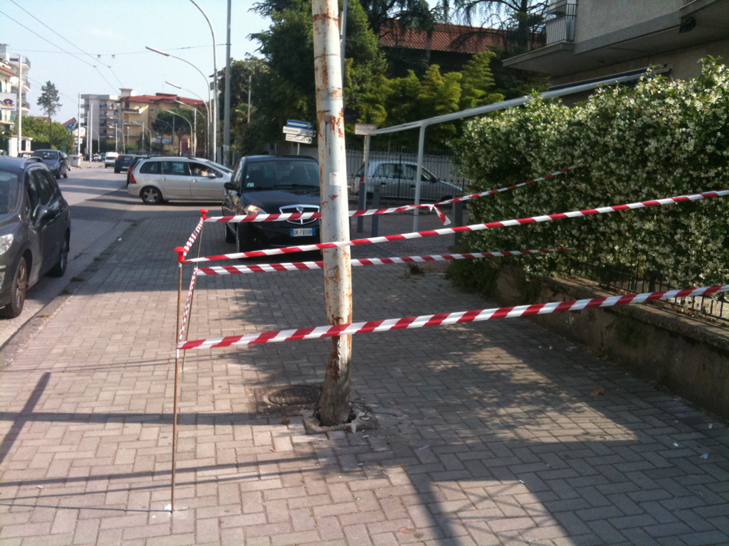 Il video girato il 13 maggio mostra chiaramente lo stato del palo, ma l’amministrazione al posto di provvedere all’eliminazione del pericolo, si è semplicemente limitata a recintare l’area con un pò di nastro colorato.
