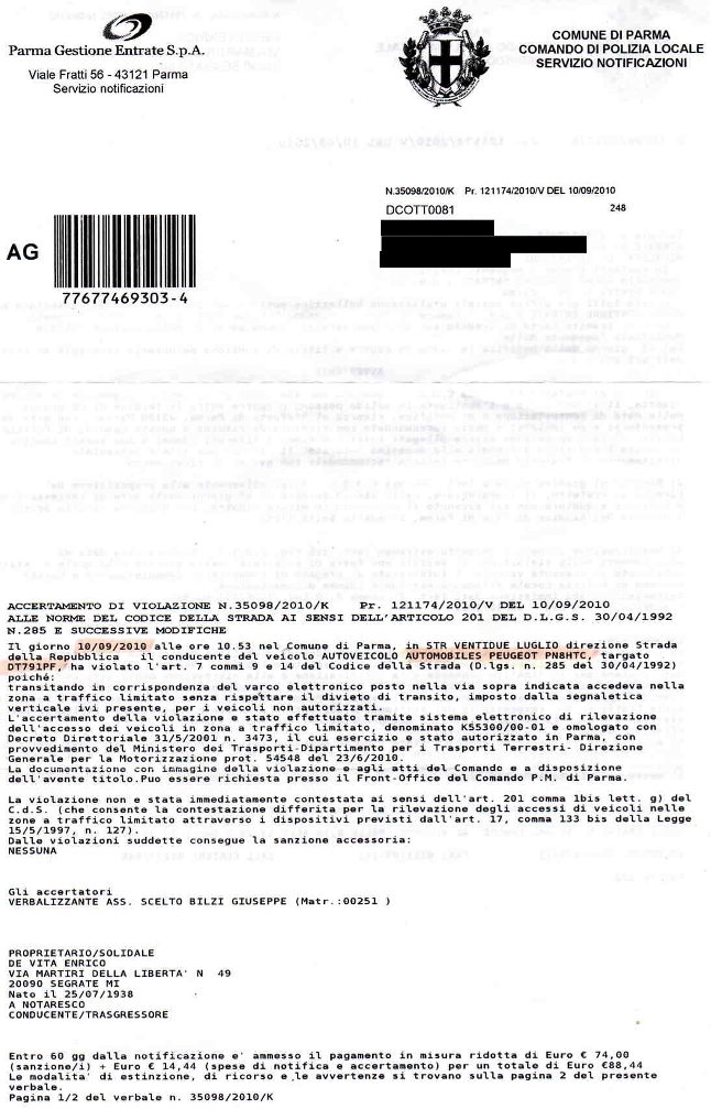 Sembra facile, ma il verbale non ci è pervenuto dal Comando di polizia locale – servizio notificazioni -, come stampigliato nella carta, ma da una società privatistica (Parma Gestione Entrate Spa, probabilmente a capitale misto).