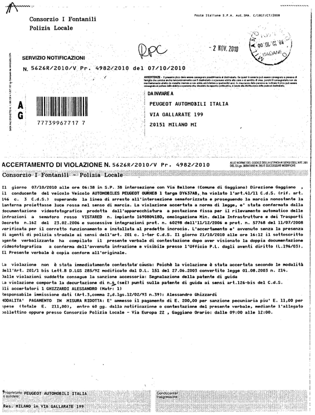Sul tavolo ci sono alcuni verbali arrivati nella giornata: in uno (vedi illustrazione a lato), vengono richiesti 211,00 euro per un passaggio col rosso nel Comune di Gaggiano (MI), più la sottrazione di sei punti dalla patente e altre 263,00 euro qualora non si comunichi entro 60 giorni il nome di chi guidava. Nella notifica, al posto del modello,c’è la scritta: “Automobiles Peugeot OURHE8”.