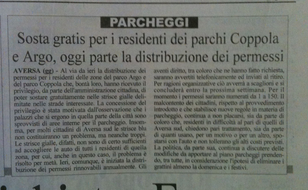 Queste sono solo alcune delle più vistose illegalità contenute nel piano parcheggi voluto dal Sindaco Ciaramella con la collaborazione del comandante dei V.U. Stefano Guarino, si perchè andando a scavare più a fondo si scoprono illeciti molto più gravi, illeciti che hanno spinto l’azienda che in precedenza effettuava la rimozione delle auto in divieto di sosta con la relativa custodia giudiziaria facente capo a Nicola Marino a denunciare alla Procura della Repubblica di S.M. Capua Vetere anche le modalità di affidamento contenute nella delibera n° 286 del 29 dicembre 2008.