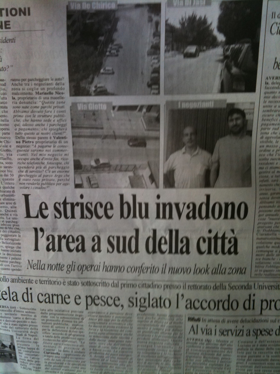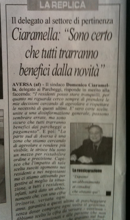 Ormai il piano di trasformare Aversa in un enorme parcheggio a pagamento si sta avviando ala conclusione, l’amministrazione Ciaramella è riuscita a verniciare di blu anche la zona sud di Aversa, zona storicamente residenziale dove non esistono posti interni ai condomini perchè quando si è costruito tanti anni fa le strade erano quasi private e tutti avevano il posto garantito, successivamente la realizzazione di molti uffici pubblici ha messo in crisi la zona andando ad eliminare i pochi posti che erano rimasti, ora è tutto finito perchè l’amministrazione Ciaramella ha trasformato tutta la zona in un enorme parcheggio a pagamento saltando a piè pari su tutti i regolamenti di attuazione che vietano la richiesta di denaro per il parcheggio se la zona non è vigilata ” sentenza della corte di cassazione5954 del 2000 ” ma a cercare bene esistono tante sentenze che spiegano il perchè i comuni non possono chiedere denaro se le strisce blu non sono regolamentari è ad Aversa non lo sono perchè non sono al di fuori della carreggiata ” La carreggiata, secondo la definizione riportata al n. 7, del comma 1, dell’art. 3 del nuovo codice della strada, è la parte della strada destinata allo scorrimento dei veicoli; è composta da una o più corsie di marcia ed, in genere, è pavimentata e delimitata da strisce di margine ed era usata anche dagli antichi Romani