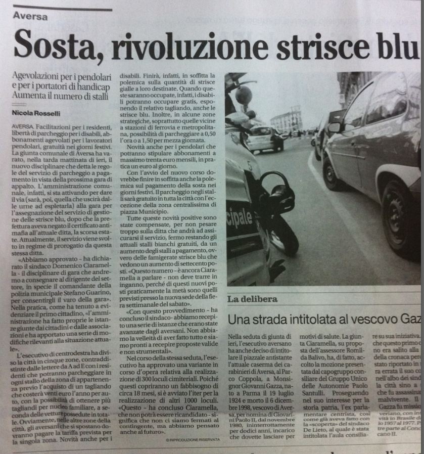 Ovviamente il contratto era già firmato e potendo sottrarre gli stalli alla nuova società, viene deciso di riservare ai residenti lo spazio dove transitava l’alifana, terreno non di proprietà del Comune e sul quale non aveva giurisdizione per elevare le multe ai non residenti, ma nonostante l’atto illecito l’amministrazione va avanti lo stesso.